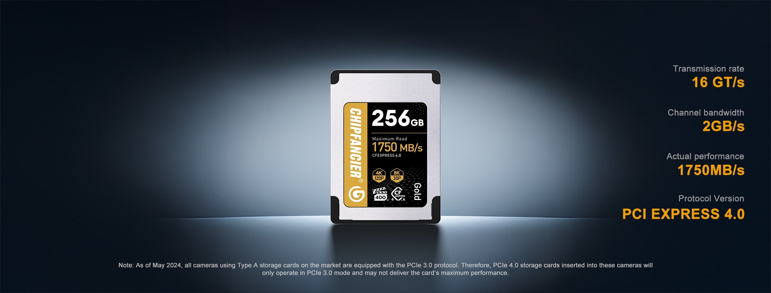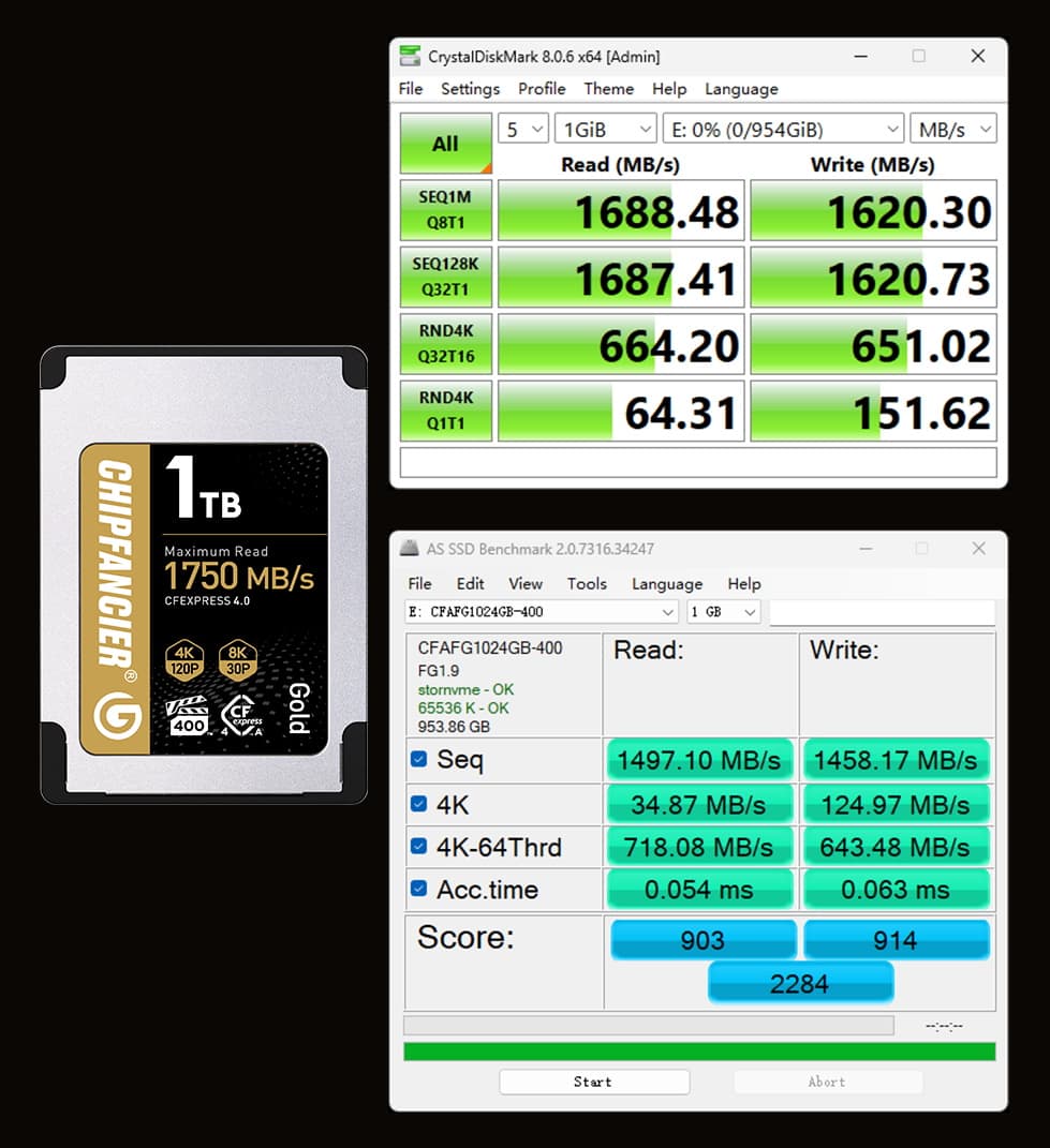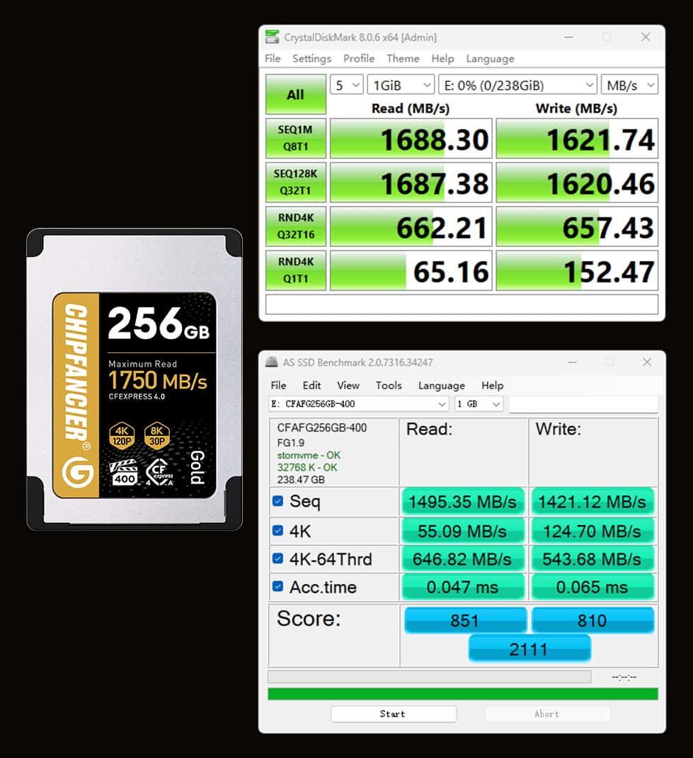 A: Gold CFA4.0 adopts PCle4.0 protocol, which doubles the bandwidth compared to the old CFA card, and together with the new master control and FLASH can run at higher frequency, so the performance is greatly improved. However, as of May '24, all cameras sold are PCIe 3.0 protocol, and can't utilize the full performance of PCle4.0. Our detailed data are all real-world tests, but please note that.