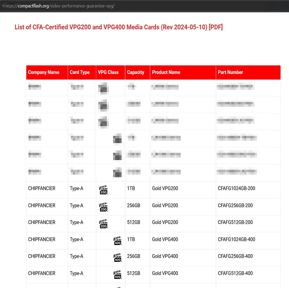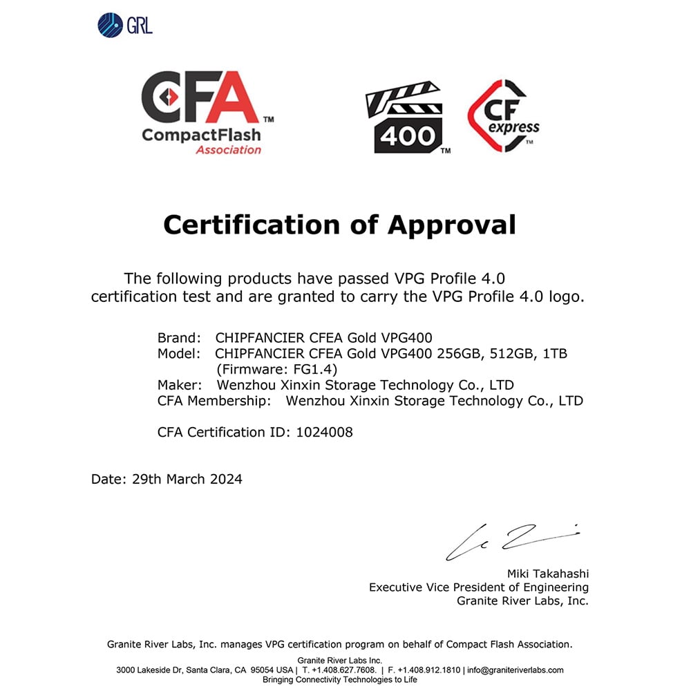 CHIPFANGIER® is an executive member of the global CompactFlash Association (CFA). We are committed to being responsible for formulating the CFA association protocol versions and voting on new protocols. This includes but is not limited to standard protocol products such as CF, Cfast, and CFexpress. Our brand products are developed, authorized, and tested in strict accordance with the standards formulated by the association to provide better stability and compatibility for the products.