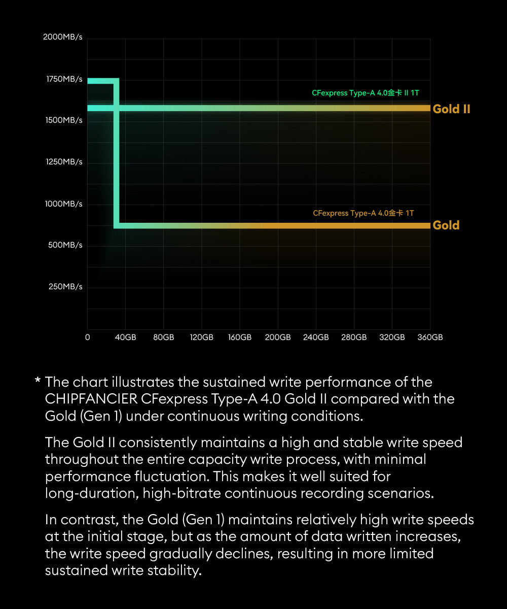 To achieve more reliable sustained write performance, the CFA 4.0 Gold II card adopts a TLC direct-write firmware algorithm, keeping write speeds stable across the entire capacity and ensuring safer, more reliable footage recording.