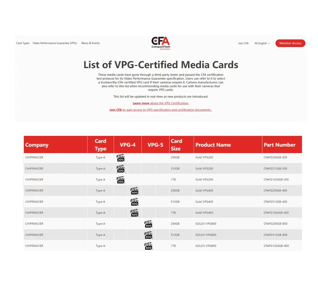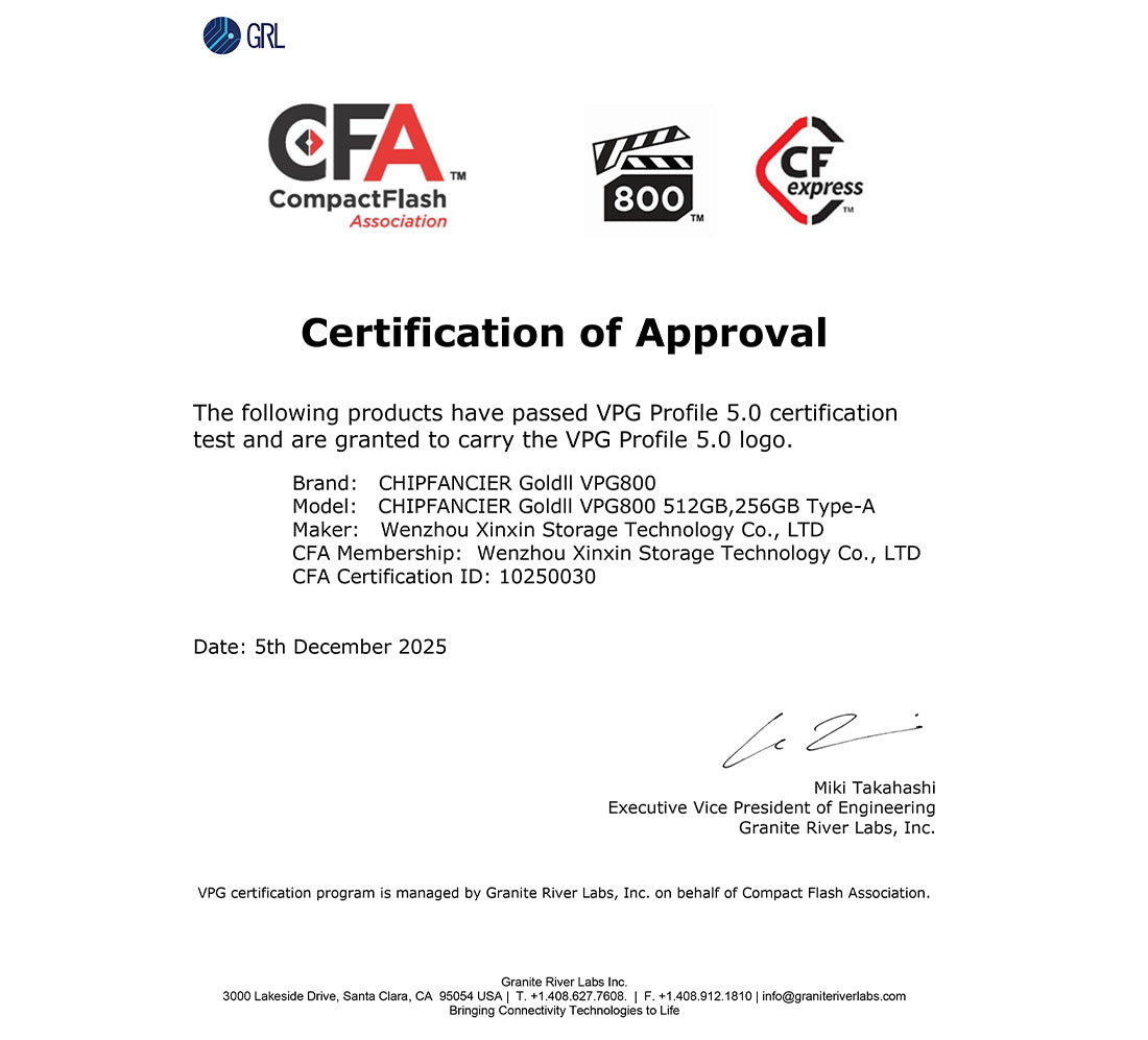 CHIPFANGIER®is an executive member of the global CompactFlash Association (CFA). We are committed to being responsible for formulating the CFA association protocol versions and voting on new protocols. This includes but is not limited to standard protocol products such as CF, Cfast, and CFexpress. Our brand products are developed, authorized, and tested in strict accordance with the standards formulated by the association to provide better stability and compatibility for the products.