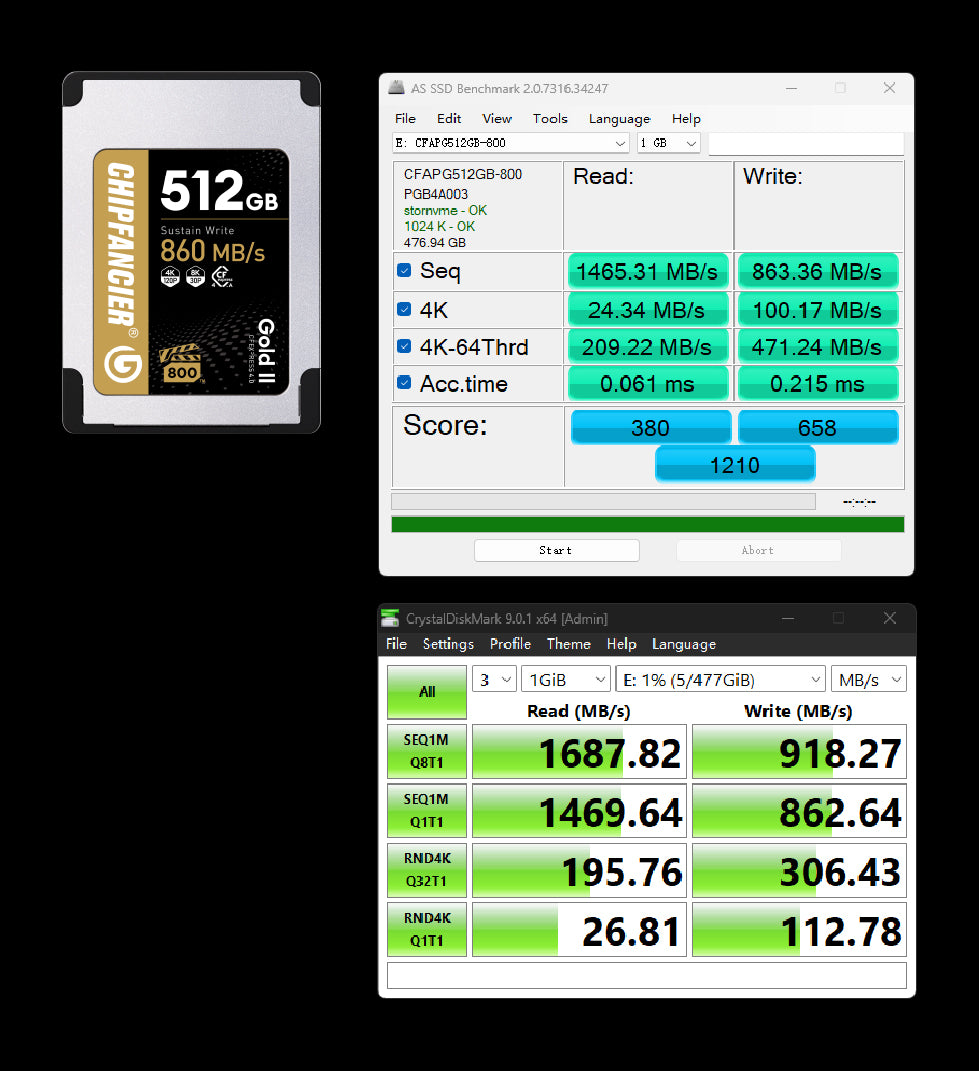 Note:Due to interface bandwidth limitations, CFexpress card readers based on PCIe 3.0 ×1 and USB 3.1 Gen 2 reach their maximum bandwidth regardless of card capacity. As a result, further testing across different capacities was not conducted.