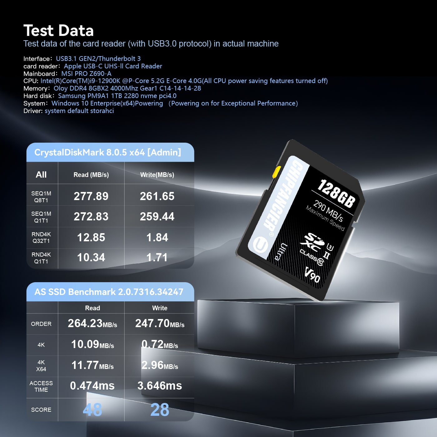 If you want to test the speed, please match the card reader that uses UHS II to maximize the performance.